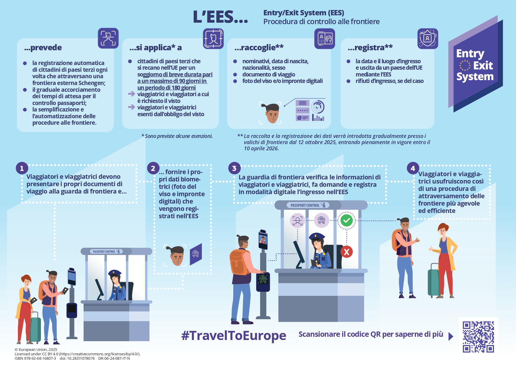 L’Unione Europea ha introdotto un nuovo sistema di ingresso/uscita (EES) che entrerà in funzione dal 12 ottobre 2025. Si tratta di una nuova procedura automatizzata di gestione e controllo delle frontiere.